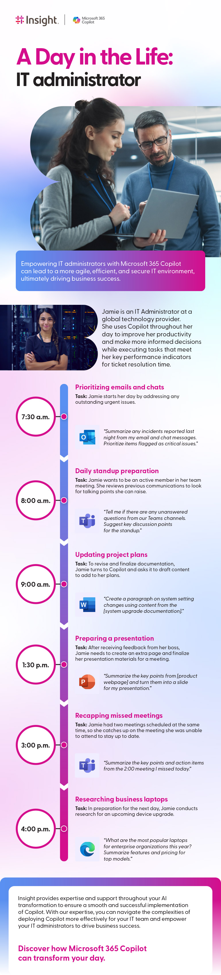 Insight provides expertise and support throughout your AI transformation to ensure a smooth and successful implementation of Copilot. With our expertise, you can navigate the complexities of deploying Copilot more effectively for your IT team and empower your IT administrators to drive business success.